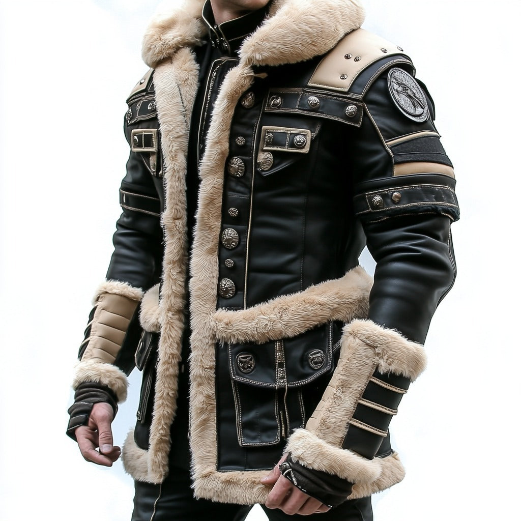 The "BASTION" jacket features a commanding black leather base complemented by rich beige fur trim along the collar, front closure, cuffs, and hemline, offering both warmth and a striking visual contrast. Intricate metallic buttons, studs, and embellishments highlight the jacket's structured design, lending it a regal yet modern appeal. The layered shoulder accents and arm straps enhance its military-inspired aesthetic, while detailed stitching and pockets add functionality and durability. This premium piece exudes sophistication and is perfect for those who want to make a powerful style statement.