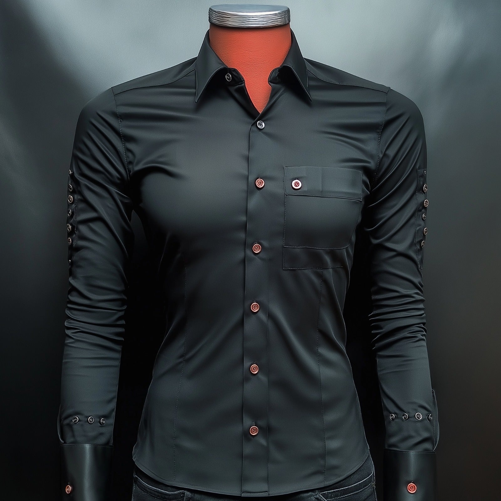 The "CODE BLACK" shirt features a sleek black fabric with a slightly glossy finish, offering a refined and contemporary aesthetic. The design includes a structured collar and a single chest pocket for a clean and practical look. Copper-toned buttons add a contrasting element of style, running down the front and accenting the cuffs and sleeves. The tailored fit enhances the wearer’s silhouette, while the attention to detail, such as reinforced stitching and buttoned sleeve embellishments, elevates the overall design. This shirt is perfect for formal events or a polished casual look.