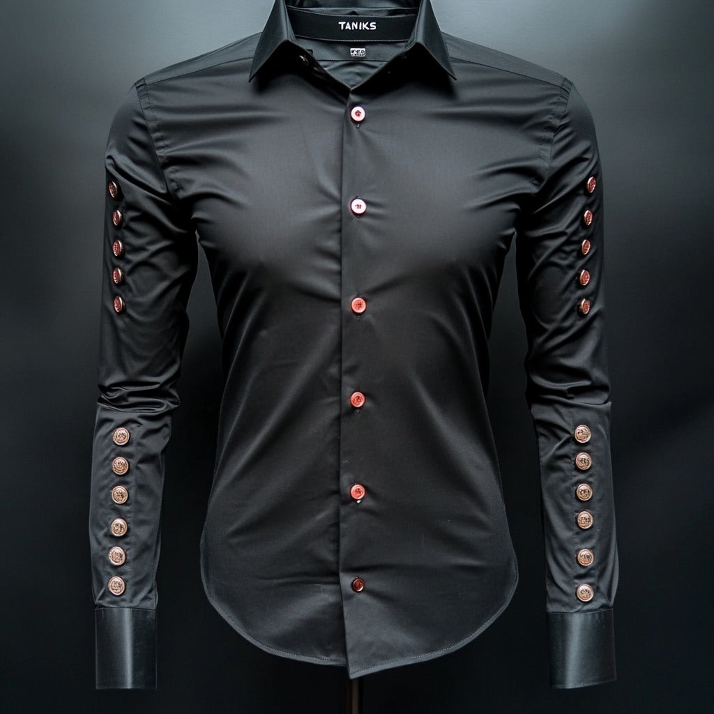 The "CODE STRATA" shirt features a deep black fabric with a smooth, tailored fit that enhances the wearer's silhouette. Its defining accents are the copper-toned buttons, which run along the front and line the sleeves, adding a unique, metallic contrast. The cuffs are elegantly detailed, and the button arrangements on the sleeves provide a layered, refined aesthetic. Perfect for formal settings or upscale casual events, the "CODE STRATA" shirt is designed for those who appreciate understated elegance with a modern twist.