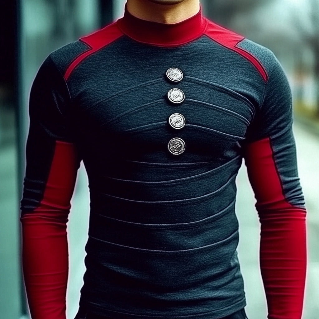 Featuring bold red accents on the sleeves and shoulders, complemented by metallic button details, the FLEX shirt exudes confidence and style. Perfect for active lifestyles or casual wear, this shirt ensures you look sharp while staying comfortable throughout the day. A must-have for those who value both form and function.