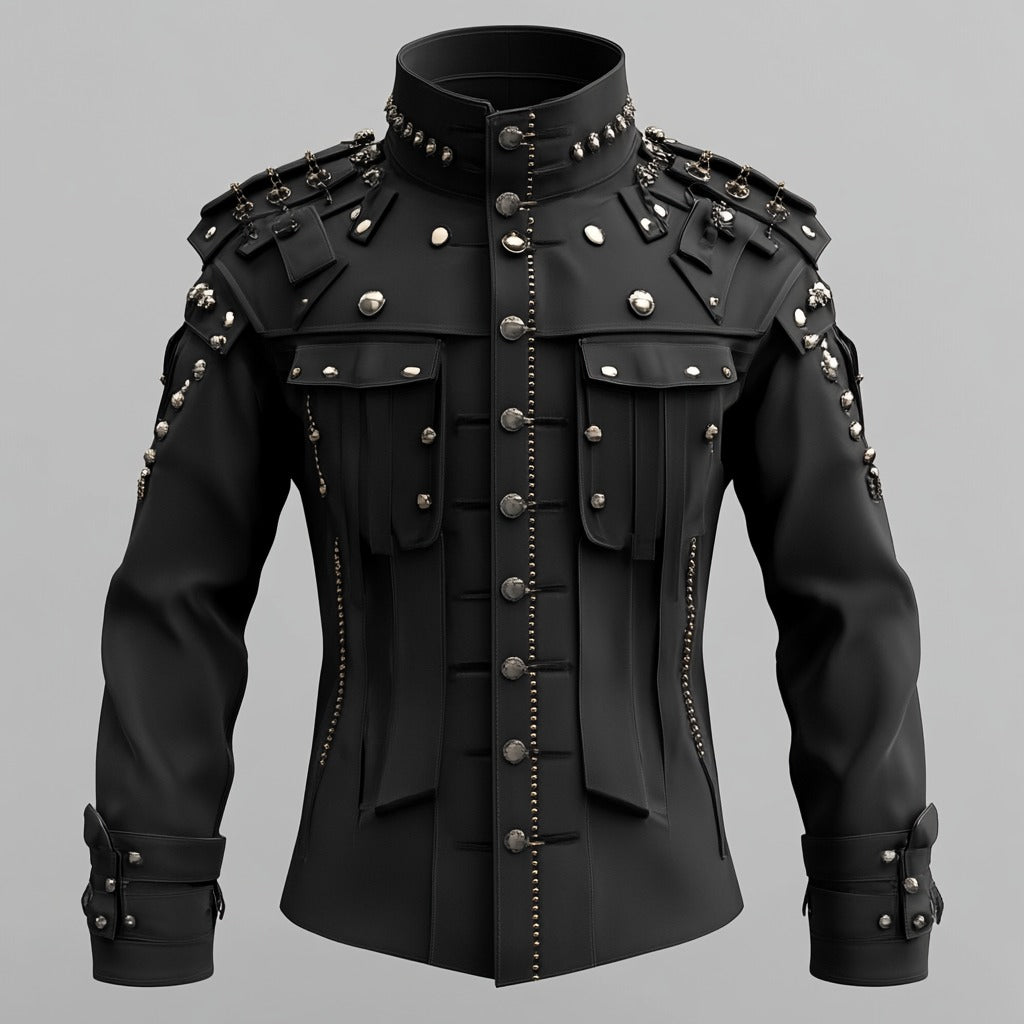 The MONARCH jacket exudes authority and sophistication with its regal design and intricate detailing. Crafted from premium black fabric, it features bold metallic embellishments, chains, and rivets, creating a striking fusion of elegance and edge.