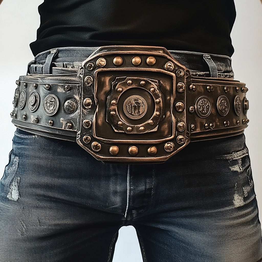 The OFF DUTY belt is a bold statement piece that combines rugged durability with striking design. Made from high-quality leather, it features an oversized buckle adorned with intricate metallic detailing and decorative coin embellishments, exuding a sense of power and individuality.