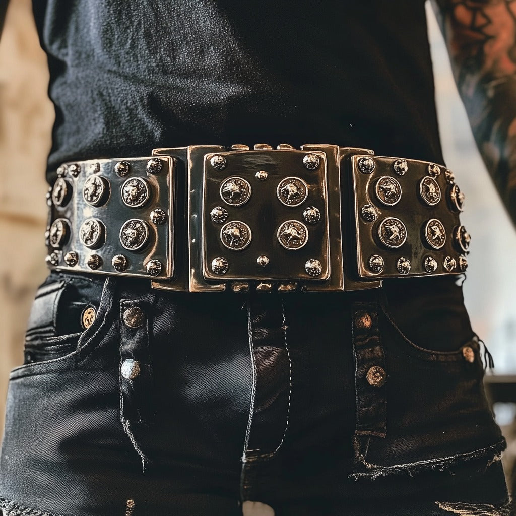 The PARADE belt is a bold fusion of luxury and edgy design, perfect for making a powerful statement. Crafted from premium black leather, it features an oversized metallic buckle adorned with intricate stud and coin details that exude sophistication and confidence.