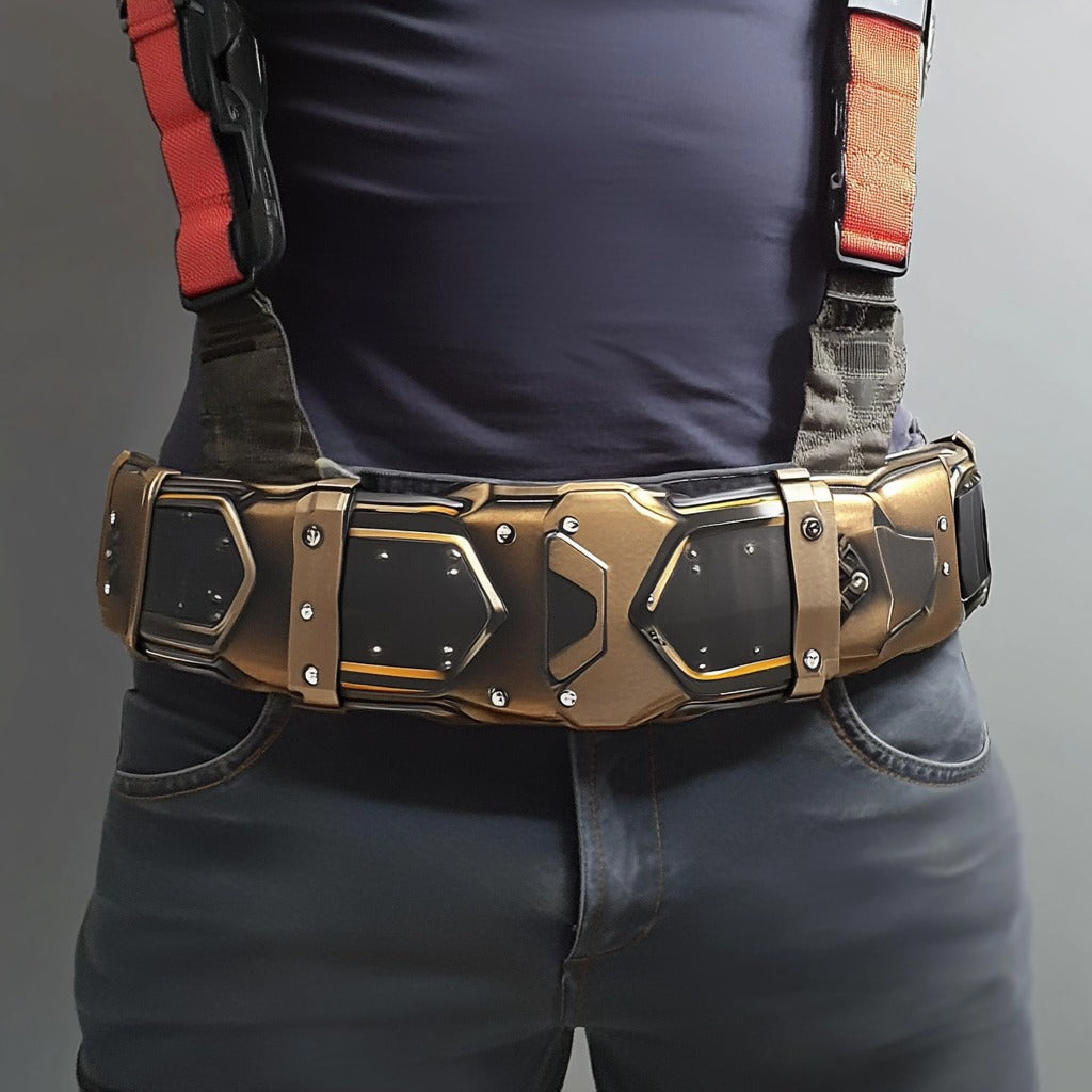 The SIGMA belt redefines functionality and modern design. Featuring a bold metallic bronze and black aesthetic, this belt showcases a structured, futuristic look with reinforced panels and riveted detailing.