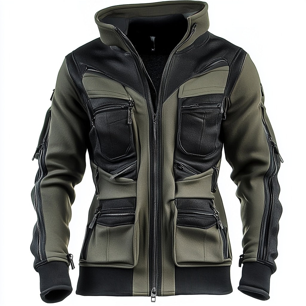 The STORM jacket is a versatile and tactical-inspired piece that combines high-performance utility with contemporary style. Featuring a two-tone olive green and black design, this jacket offers an array of functional zippered pockets, giving you ample storage for your essentials while maintaining a sleek aesthetic.