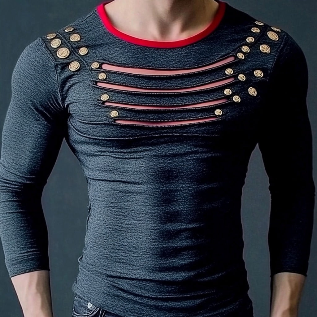 The Trail Statement Top is the ultimate fusion of bold design and premium craftsmanship, ideal for those who want to stand out. Made with a sleek, form-fitting fabric, this top features intricate red leather strips across the chest paired with golden button accents, creating an edgy yet elegant look. Perfect for stylish casual outings or evening events.